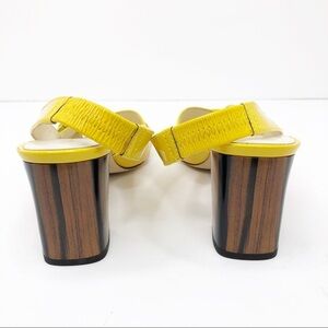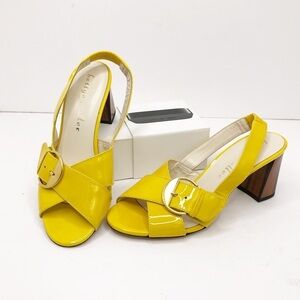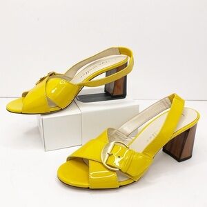 Bettye Muller Yellow Patent leather sling back shoes, with wood detailed heel and gold tone buckle hardware, made in Italy