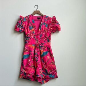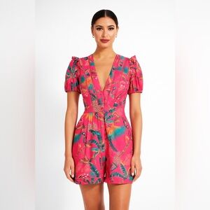 BEULAH Bright Pink Floral Tropical Macaw puff sleeve Romper Button Down Ruffle