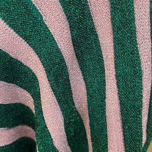 Description A metallic knit ribbed skirt featuring all-over striped pattern, falls knee-length, high-waist construction, and elasticized waistband....