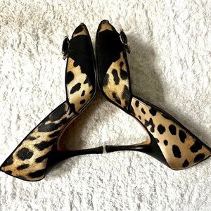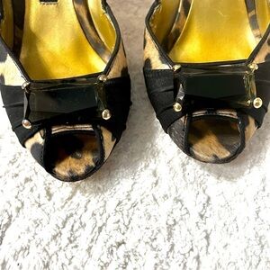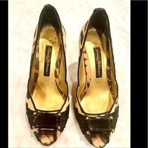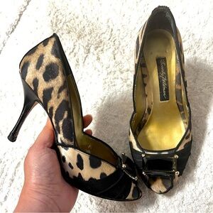 BEVERLY FELDMAN Leopard-Print Pump satin rhinestone peep toe women size 5.5