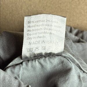 98% cotton 2% Lycra. Machine washable.