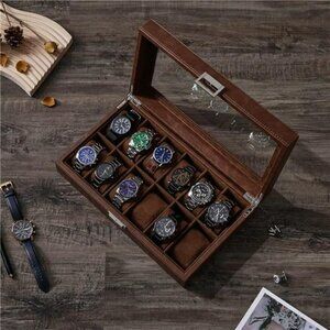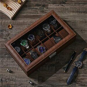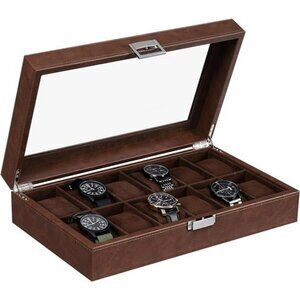 BEWISHOME 12 Slot Watch Box Organizer Glass Lid Faux Leather Display Case