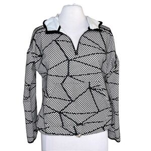 Black & White Webbing Stretch Mesh Overlay 1/4 Zip Warm-Up Hoody Pullover Windbreaker w/ Bungee Cord & Toggle Hem Beyond Yoga