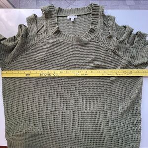 What I Love About It: This wonderful moss/sage green sweater is perfect for the cooler weather. Fun keyhole openings down the sleeves make it a unique style. Longer length with high/low hem and side slit. Super snuggly!
