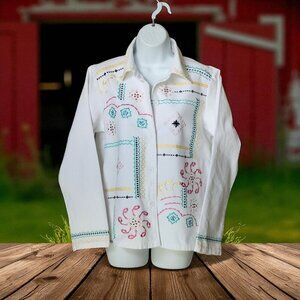 BFA Classic White Cottagecore Embroidered Denim Button Up Shaket SZ S