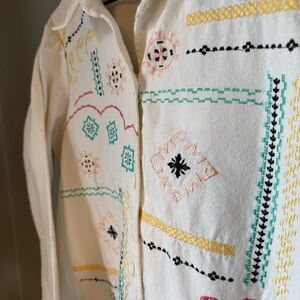 This is a beautiful white lightweight boxy denim button up jacket by BFA Classics. It has pastel color embroidery making it very Cottagecore or perfect resort wear. This is pre-owned in excellent condition with no observable damage.