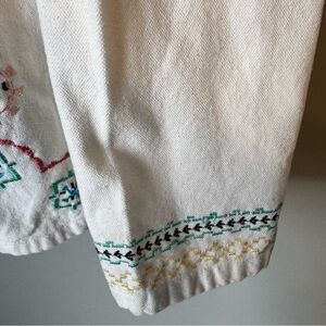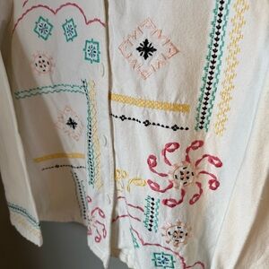 This is a beautiful white lightweight boxy denim button up jacket by BFA Classics. It has pastel color embroidery making it very Cottagecore or perfect resort wear. This is pre-owned in excellent condition with no observable damage.