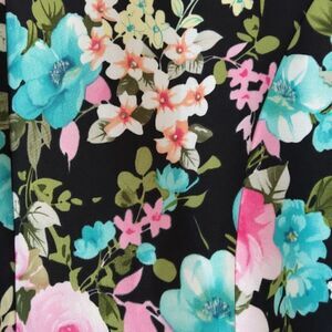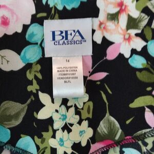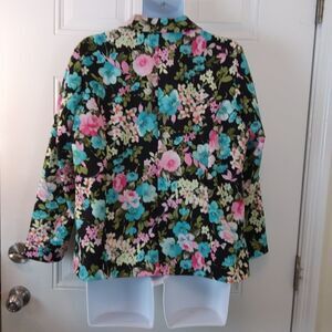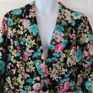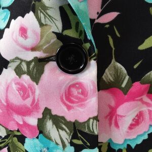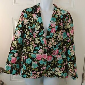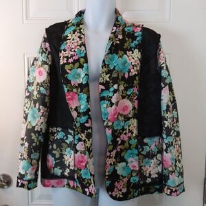 BFA Classics black floral unlined Blazer with one button closure, is 2 sewn pockets.