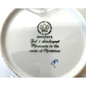 This collectible plate from B&G Copenhagen Porcelain showcases a serene winter scene with pheasants in the snow, crafted in 1970. A perfect addition for collectors of vintage porcelain or holiday-themed decor. The plate is designed for display, featuring intricate details and a classic blue and white color palette.