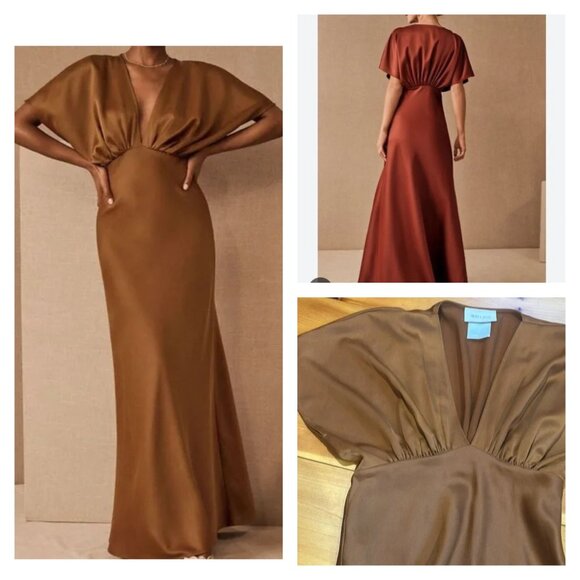 BHLDN 6 Leila Deep-V Flutter Sleeve Satin Mocha Gown Dress Maxi 58"