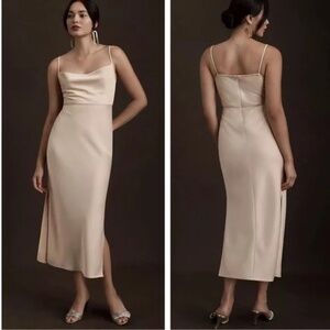 #BHLDN #Anthropologie #CaliSlipDress #CowlNeckMidi #OysterBeige #SatinSlipDress #BridesmaidDress #NeutralToneDress #EveningWear #MinimalChic