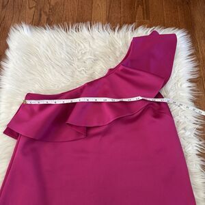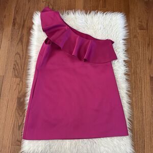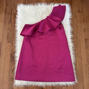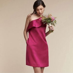 Beautiful Hitherto by Anthropologie BHLDN one shoulder ruffle mini dress. Size womens 12. Has side zipper to make getting it on and off very easy. Liner. Thick quality. See pics for measurements. Has pockets. This is a bright pink. Perfect for wedding guests, cocktail events, date nights, or vacations. From a smoke free/pet free home.