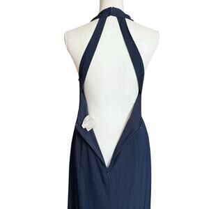 BHLDN gown from Anthropologie's formal wedding bridesmaid collection. Montreal halter maxi dress in midnight navy blue crepe. Fitted silhouette to the knee with sexy high slit. Open back, zipper closure with hook in eyes behind the halter neck, women's size 8 in excellent condition.
