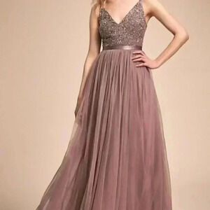 Featuring a deep v-neck and matching back, this sleeveless dress pairs a sequin-covered bodice with a frothy tulle skirt. A grosgrain ribbon defines the waist.