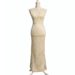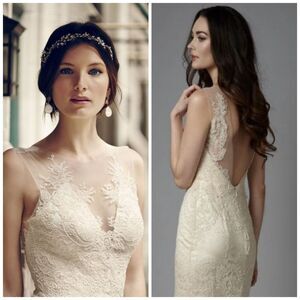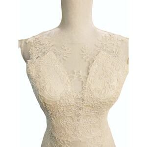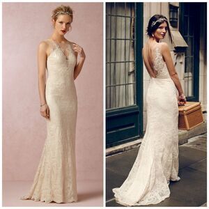 BHLDN Catherine Deane Yasmin wedding gown. Intricate floral lace pieces on this stunning figure hugging dress. Sheer illusion v-neck with plunging v-back. Slight mermaid silhouette. Train in back with button & loop to hold it up. Zipper closure in back. Silk lining. Bust has some light cups in it. There are some sewing marks inside at bust (shown in pics) where added cups were sewn & removed. I still have the cups if buyer wants them. Excellent condition.