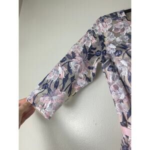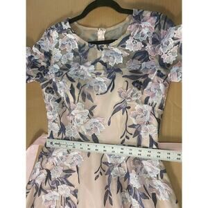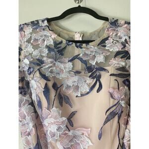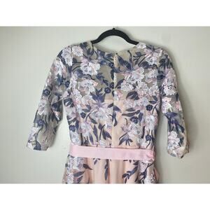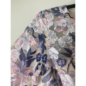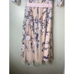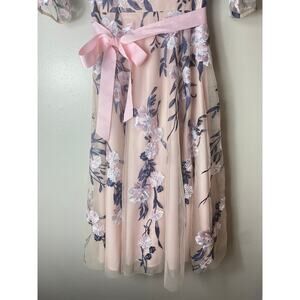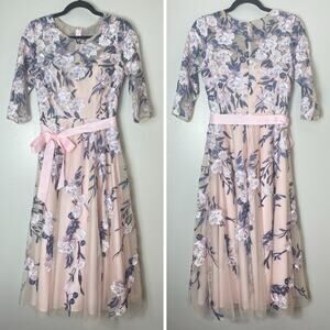 BHLDN ANTHROPOLOGIE MIDI FLORAL TEA LENGTH DRESS 6 PINK MIDNIGHT DARK NAVY BLUE LACE EMBROIDERED LINDEN MOTHER OF BRIDE SATIN BOW TIE WAIST SASH FAIRY WHIMSICAL COCKTAIL PARTY