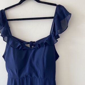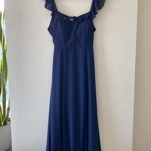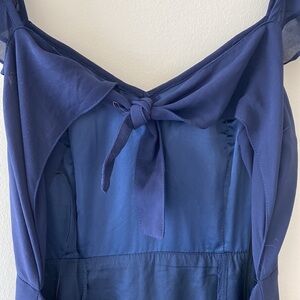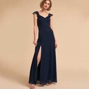 Part of a special collection from BHLDN. For the full assortment, visit BHLDN.com. This airy chiffon maxi has a ruffled sweetheart neckline and an open crossed back accented with a self-tie bow. Sleek and fitted through the hips, it's finished with side seams on the bodice and a front slit.