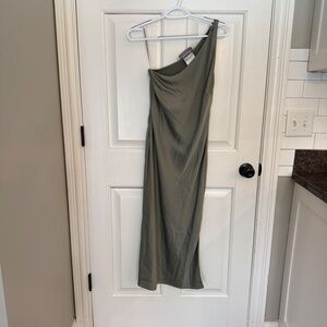 BHLDN Dylan One-Shoulder Satin Side-Slit Gown in Moss 45706