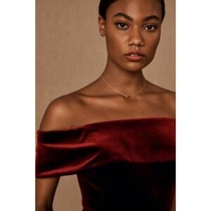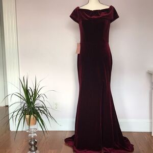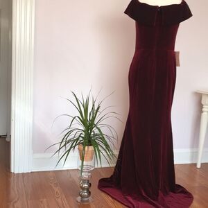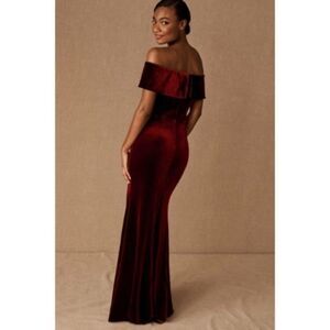This lush velvet off-the-shoulder dress evokes Old Hollywood glamour, with a subtly flared skirt that features a deep front slit.
