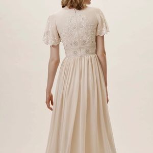 This beautiful blush-colored BHLDN dress is brand new with tags, never worn. With a plunging neckline and scalloped flutter sleeves, the beaded bodice of this chiffon dress adds just the right amount of sparkle. It’s bra-friendly, though it’s fitted enough that it’s very comfortable and flattering without one. Fits true to size.