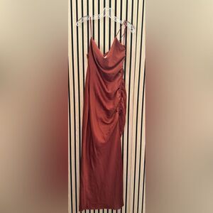 The BHLDN Jennings Cowl-Neck Satin Gown features a softly plunging neckline, endlessly elegant side-ruching, and a daring side slit, adding dramatic flair to the walk down the aisle - and the dancing you'll be doing late into the evening.