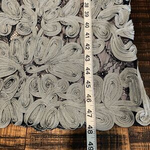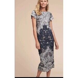 The BHLDN JS Collection SANTIAGO Dress in Navy/Cloud is a stunning Anthropologie midi cocktail dress with a beautiful floral pattern and a round neck. The short cap sleeves and nylon blend material make it perfect for formal occasions or parties. The dress features a zip closure and is designed in a sheath style, ideal for all seasons. With its elegant blue and navy color palette, this dress is a must-have for any fashion-forward woman's wardrobe.