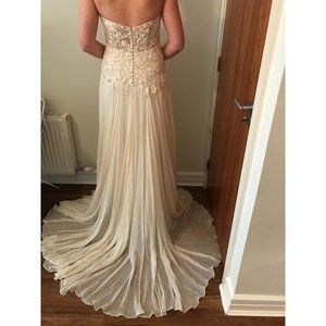The English Ivy Appliqués adorn the natural waist bodice and the sheer back bodice with a slight basque waistline and corset detailing. The dress is fitted through the hip to highlight feminine curves then flows into a godet skirt with a court train. Covered buttons mask a center back zipper.