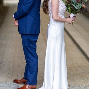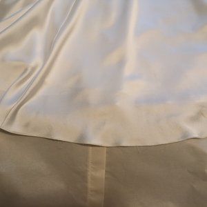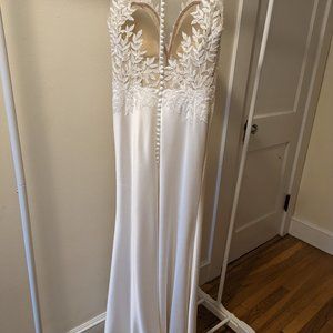This dress is in good used condition as I wore it to my ceremony and reception. Only a few alterations were made. The shoulder straps were taken in slightly and the bra cups were replaced for a larger size (34DD) - these can easily be replaced. The hemline was also shortened (I'm 5'2" and wore 2.5" heels) to a sweep train.