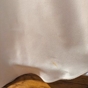 The dress was professionally dry cleaned, but there are a few minor stains on the back hemline that the cleaner could not get out. They are very minimal and not extremely visible, especially with the way the dress moves and flows in the back. There are also a few minor pulled threads on the lower front half of the dress. These are also not very visible, as you can really only see them if you're looking at the dress very closely. See attached photos. Message me for any questions about these minor flaws - I'm happy to send additional photos of the dress!