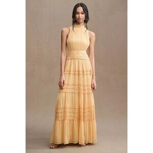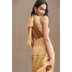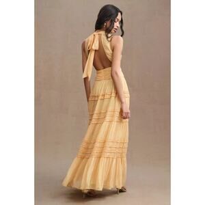 BHLDN Juniper Metallic Tiered Backless High Neck Gown Light Yellow Size 12