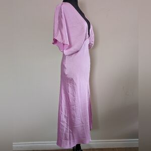 NWT Chic pink satin dress featuring a deep V-neck and a stylish slit. Perfect for special occasions.