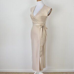 Wrap bust. V-neck. Cap sleeve. Front skirt slit. Side zipper. Midi length. Not lined.