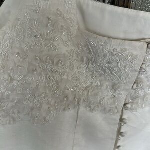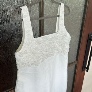 Chic white mini dress featuring a floral textured bodice. Includes matching long gloves for a sophisticated look.
