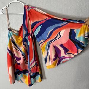 Let the colors pop as you shimmy down the dance floor in this one-shoulder silhouette. With its multi-printed satin fabric, the Stevie defies tradition while maintaining a go-to silky feel.
