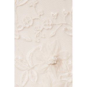 Dripping with floral embroidery and dimensional organza applique work, this tulle gown is endlessly romantic. A plunging neckline and low back lend the bodice its sultry silhouette, while a full train makes a dramatic finishing flourish. By BHLDN.