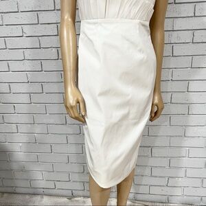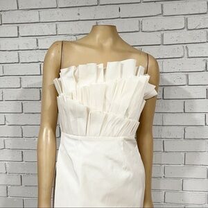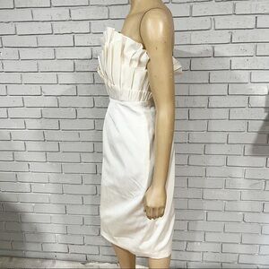 This modern midi dress was named for renowned architect Frank Gehry, a nod to its strikingly architectural pleated bodice. Its micro-ribbed faille fabric combines structure and stretch, molding to the body while ensuring the intricate pleating remains crisp. Beneath the bodice, a corset creates a flawless fit. Dress color is ivory.