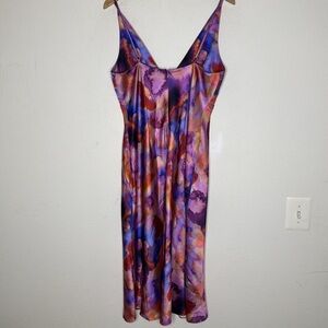 In excellent condition and no signs of wear. It is a size large. BHLDN Hazel V-Neck Printed Stretch Satin Midi Dress, Pink Multi, the classic and elegant BHLDN Hazel dress will make you feel special while you celebrate any special occasion. Featuring a v-neckline, flattering silhouette, and overall charm, you'll be set to throw down on the dance floor. From armpit to armpit is about 19 inches and 47 inches long. All items have been cleaned and comes from a smoke free home.