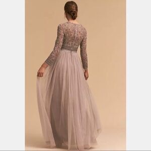 An airy, tulle skirt floats effortlessly from ceremony to dance floor, while its fitted bodice (encrusted in delicate beading and floral appliqué) and long sleeves keeps things chic and interesting. Please note: contrary to the images shown, the sleeves on this dress are fully beaded.