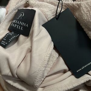 ADRIANNA PAPELL Metallic thread gives this stretchy column dress a golden sheen.The high neckline gives way to a keyhole back, and a satin ribbon defines the waist.