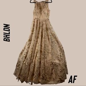 Part of a special collection from BHLDN. For the full assortment, visit BHLDN.com. This ethereal A-line dress is cut from tulle and embroidered head-to-toe with delicate gold florals. A cutaway halter neck and back bow finish the look.