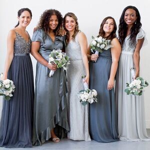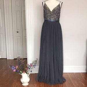 Featuring a deep v-neck and matching back, this sleeveless dress pairs a sequin -covered bodice with a frothy tulle skirt. A grosgrain ribbon defines the waist.