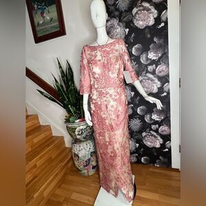 This creation blends glamour with a bit of vintage flair. Floral lace features a festive sheen and soft pleats on one side give a subtle feel.