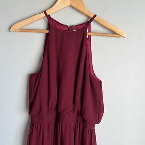 A high-neck blouson bodice tops an airy chiffon skirt, complete with a deep slit.