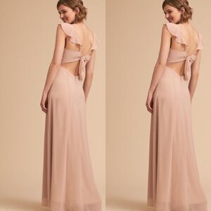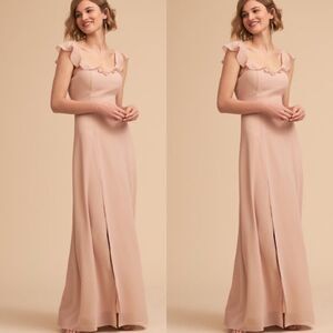 This airy chiffon maxi has a ruffled sweetheart neckline and an open crossed back accented with a self-tie bow. Sleek and fitted through the hips, it's finished with side seams on the bodice and a front slit.