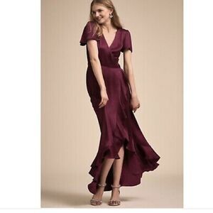 Secured with a graceful bow, this richly hued wrap dress is complete with a ruffled high-low hem