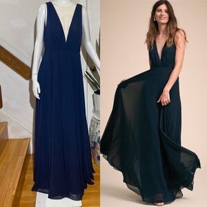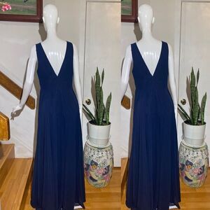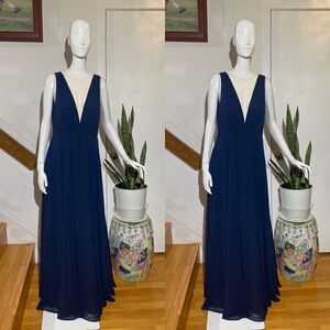 The Ryan dress is an elegant A-Line silhoutte with a chic plunging V neck in our flowy Luxe Chiffon. llusion tulle at the neckline creates a fitted bodice while a deep V in the back gives way to a romantic long circle skirt with a whimsical sweep. This romantic bridesmaids dress is fully lined with a center back invisible zipper.