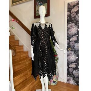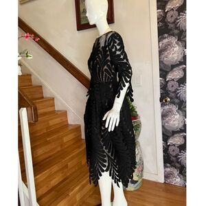 Leafy applique lends intricate texture to this sophisticated midi dress with a chic illusion neckline and three-quarter sleeves.