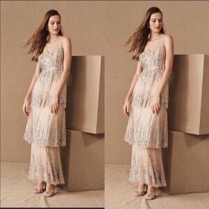 Shimmering embellished rows of sequins add glamorous sparkle to the v-neck bodice and tiered skirt of this romantic maxi dress.