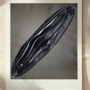 Interior: Fully lined with signature BHPC logo fabric. Features three main large compartments (two zippered, one open/padded), dedicated card slots, clear ID window, and other slip pockets.