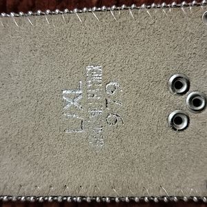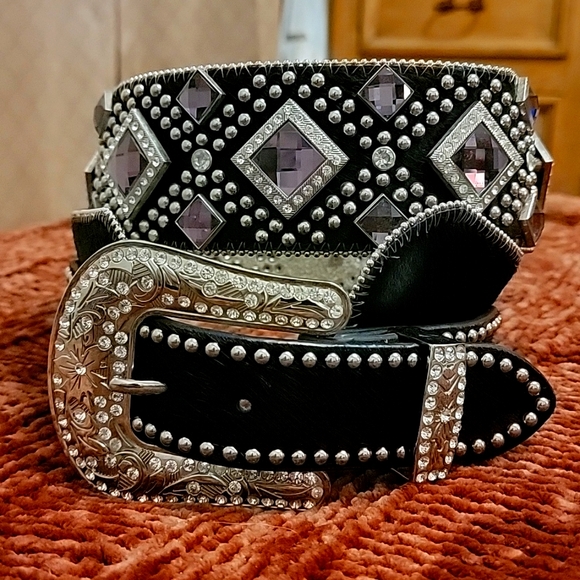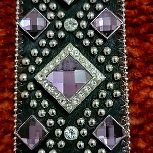 BHW Rhinestone Belt, Size XL, Purple & Clear rhinestone conchos, silver beads on the edge. Black hair on hide leather.